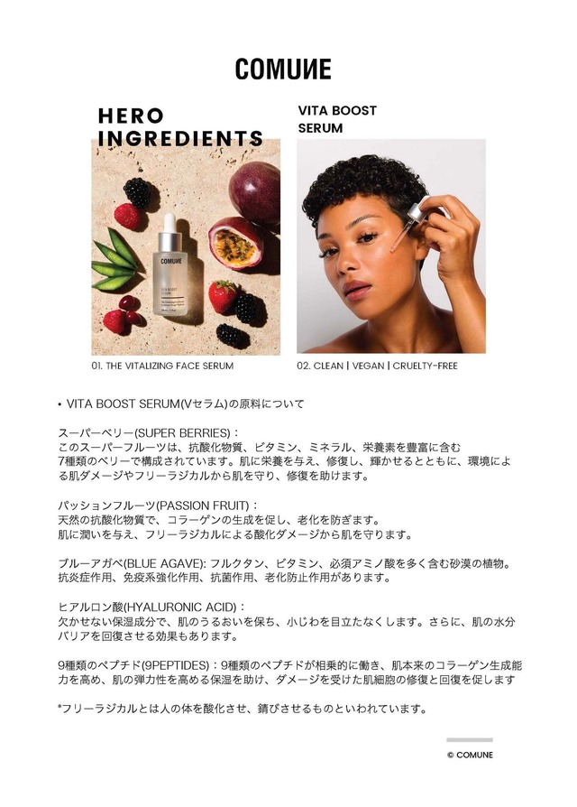 最も重要な核となる成分は、抗酸化物質が豊富なスーパーフードからの抽出物、ハーブ、豊富な植物油などのクリーンなスキンケア。COMUNEの製品は植物由来成分を中心としたヴィーガンで動物実験を行なっておらず、性別を超えてあらゆる肌タイプの方に適したシンプルなケアです。
